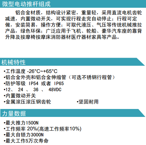 鋁合金材質(zhì),結(jié)構(gòu)設計緊密,重量輕,采用直流電機齒輪減速,內(nèi)置微動開關,可實現(xiàn)行程走完自動停止;行程可定做,安裝簡易,操作方便;可取代液壓、氣壓等傳統(tǒng)機械推拉產(chǎn)品,綠色環(huán)保;廣泛應用于飛機、輪船、豪華汽車座的靠背升降及按摩椅按摩床消防器材醫(yī)療器材家具等產(chǎn)品。