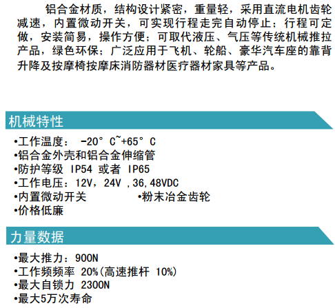 鋁合金材質,結構設計緊密,重量輕,采用直流電機齒輪 減速,內置微動開關,可實現行程走完自動停止; 機械特性: